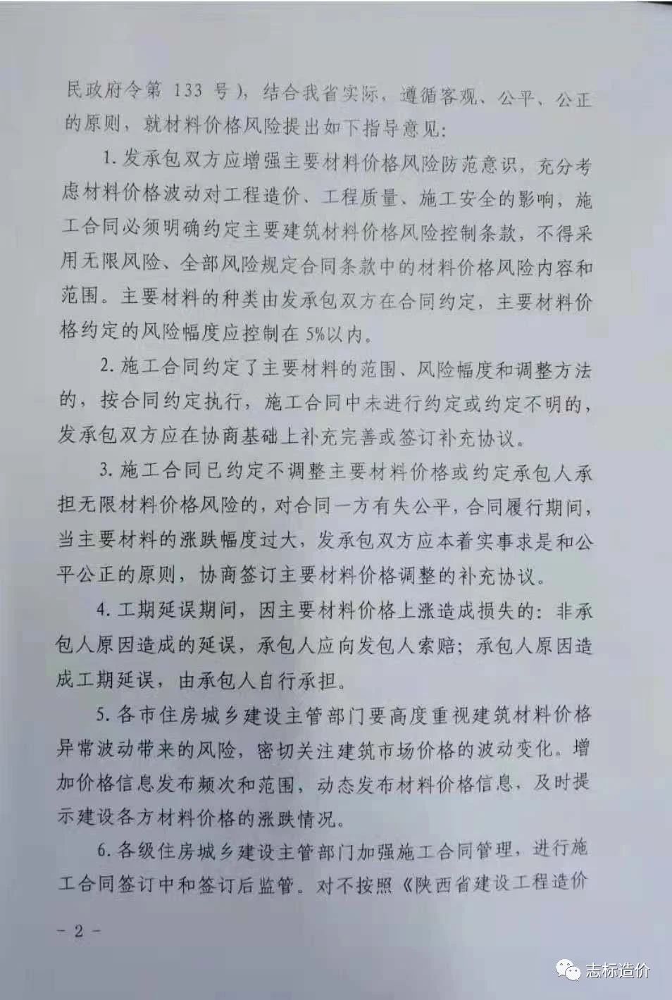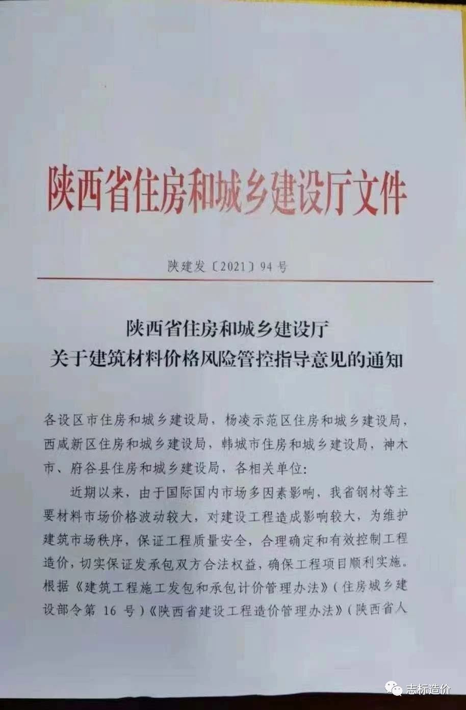 一、從2021年春節(jié)后受國際國內市場多因素影響,鋼材、銅等建筑材料價格波動較大,對建筑工程造成影響較大,2021年5月19日陜西省住房和城鄉(xiāng)建設廳發(fā)布:陜建發(fā)【2021】94號文件關于建筑材料價格風險管控指導意見的通知。