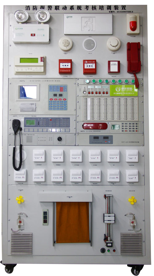 實物訓練標準裝置主要由點型光電感煙火災探測器、點型感溫火災探測器、火災探測器通用底座、手動火災報警按鈕、消火栓按鈕、輸入模塊、輸出模塊、輸入/輸出模塊、隔離器、固定式消防電話分機、消防電話插孔接口、消防電話分機、火災聲光報警器、火災報警控制器(聯動型)、總線制操作盤、終端器、直接控制盤、智能電源盤、火災顯示器、消防廣播分配盤、消防電話總機、廣播功率放大器、消防廣播、直流24伏轉換繼電器、自鎖型信號按鈕、消防應急燈、消防應急標志燈、非消防電源切斷模擬裝置、消防泵模擬裝置、噴淋泵模擬裝置、消防電梯模擬裝置、防火卷簾門模擬裝置、排煙風機模擬裝置、正壓送風機模擬裝置、正壓送風閥模擬裝置、排煙防火閥模擬裝置、時間繼電器、蓄電池、設備機柜、配線線路等各種分立設備及元器件組成,除消防聯動模擬裝置外,其它部件均為工程現場安裝的實際設備,最大限度的接近工程現場工況,為廣大學員畢業后迅速融入實際,打下了堅實基礎。